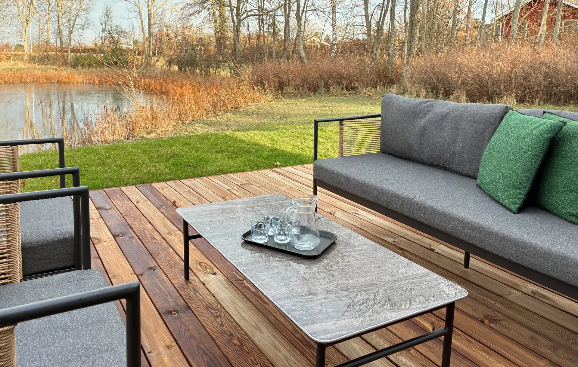 Treten Sie hinaus in den geschützten Innenhof aus Holz und finden Sie Ihren Lieblingsplatz im Freien. Verbringen Sie entspannte Stunden auf den Loungemöbeln und genießen Sie den freien Blick auf den kleinen See und die umliegende Landschaft. Nutzen Sie die ruhige Lage für entspannte Abende und erholsame Stunden unter freiem Himmel.