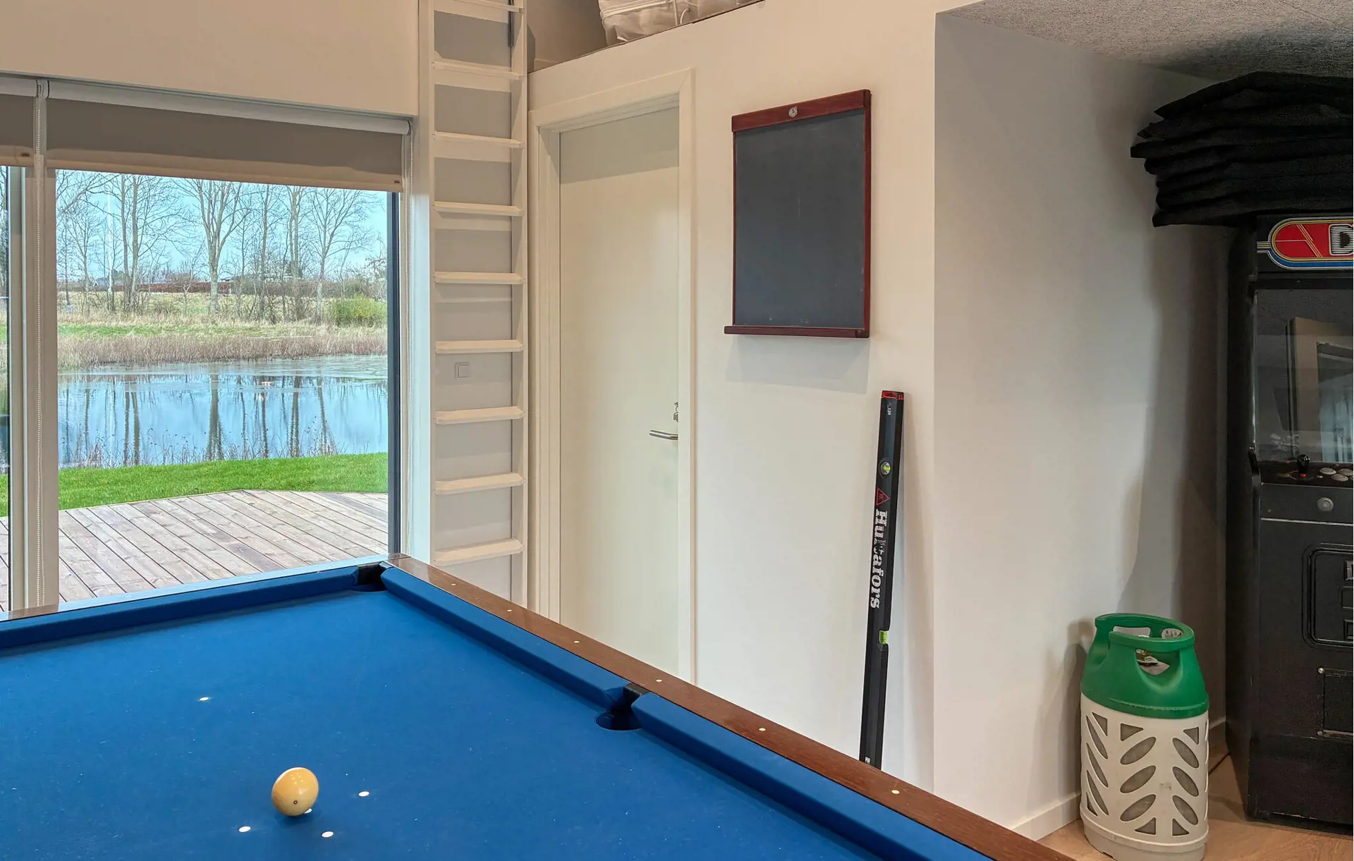 Lassen Sie die angenehme Stimmung im offen gestalteten Innenbereich auf sich wirken. Nehmen Sie auf den komfortablen Sofas Platz und genießen Sie den Blick ins Grüne. Hohe Decken, dezente Farben und ausgewählte Materialien schaffen eine ruhige, elegante Atmosphäre. Nutzen Sie den langen Esstisch für gemeinsame Mahlzeiten oder ausgedehnte Abende in geselliger Runde. Bereiten Sie Ihre Speisen in der hochwertigen Küche mit Kochinsel und modernen Geräten zu. Spielen Sie auch eine Runde Billard im Aktivitätsraum mit Blick auf das Wasser.