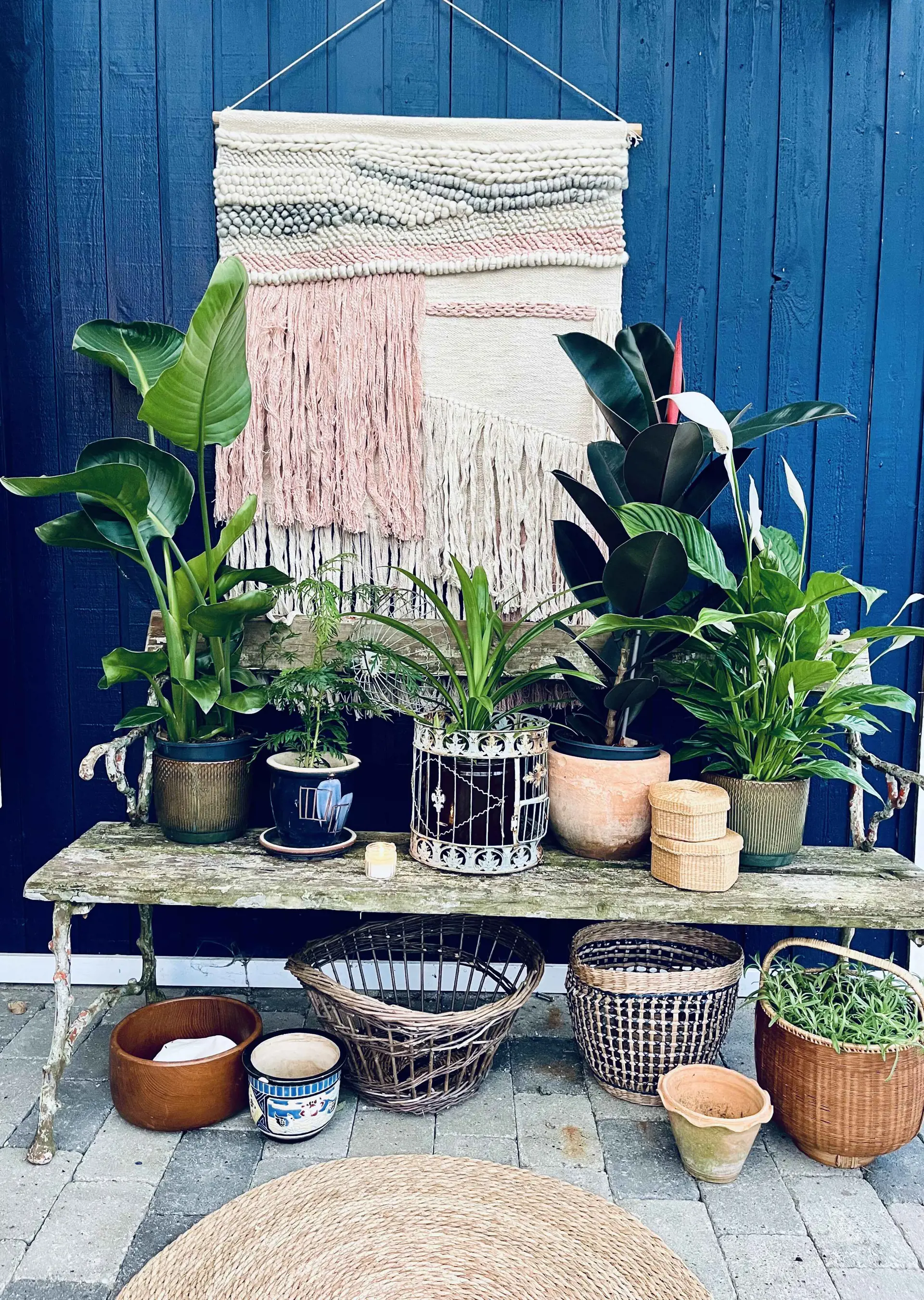 Sonnige Terrasse und kleiner Garten mit Möbeln und Grill