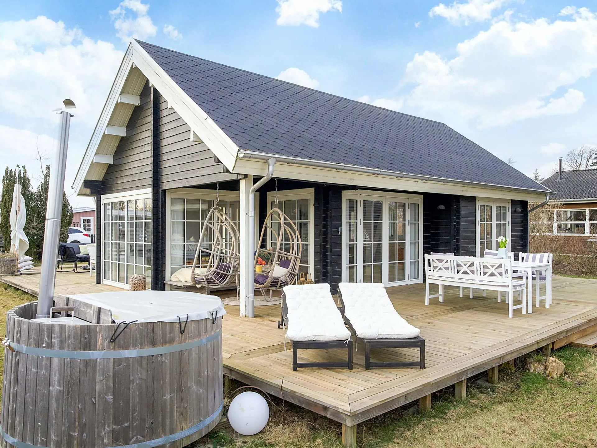 Ein herausragendes Merkmal für ultimative Entspannung ist der beheizbare Badezuber im Außenbereich mit Platz für 4 Personen - ein einzigartiges Badeerlebnis unter freiem Himmel!