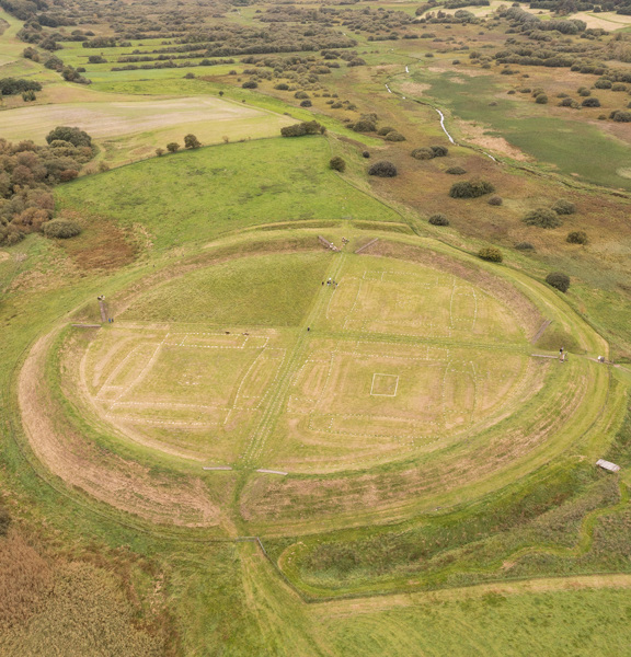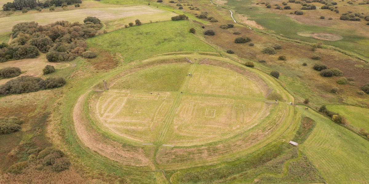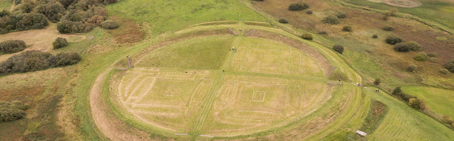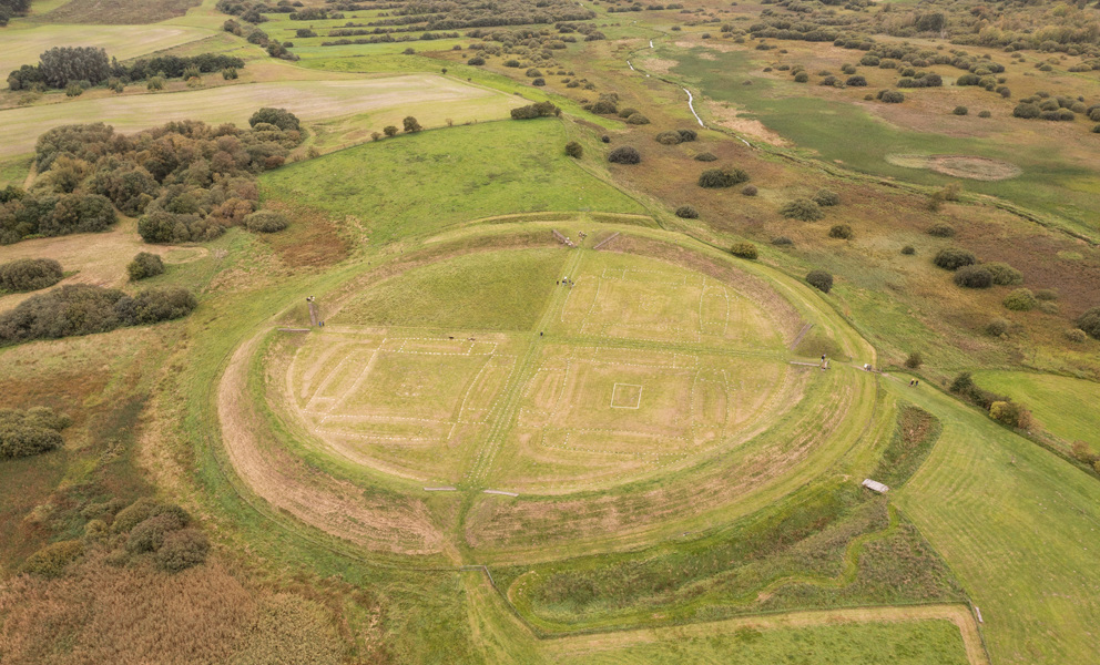 Der gewaltige Erdwall, der heute hier zu sehen ist, ist eine Rekonstruktion. Die Umrisse der 16 Häuser, die einst innerhalb des kreisförmigen Erdwalls gestanden haben, sind mit Steinen am Boden angezeigt.